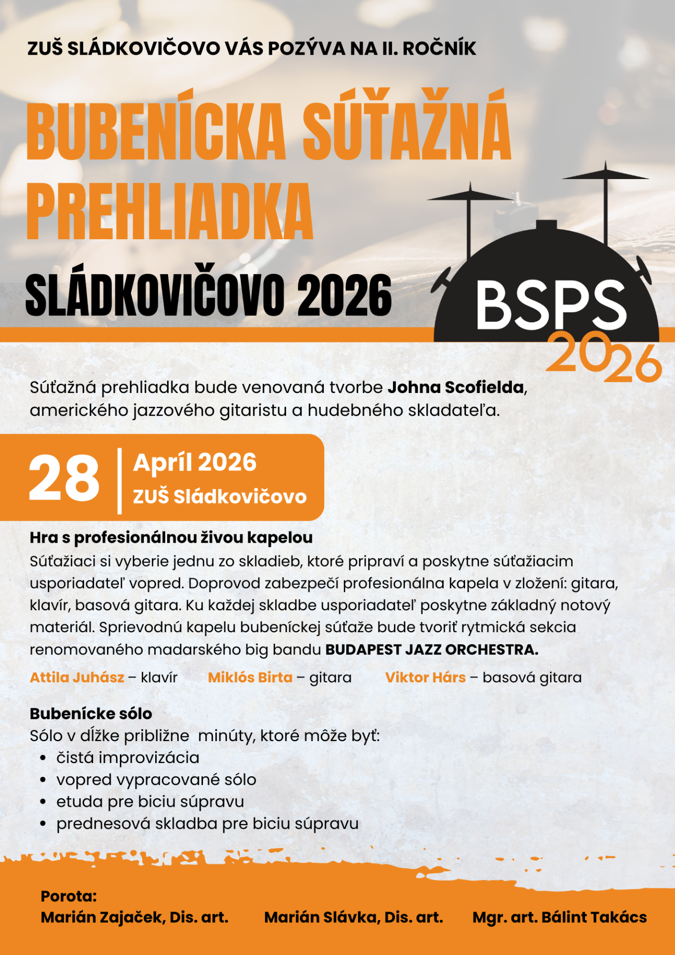 Spojená škola - ZUŠ Sládkovičovo vyhlasuje druhý ročník súťažnej prehliadky v hre na biciu súpravu. Súťaž sa uskutoční 28. apríla 2026 v Koncertnej sále ZUŠ Sládkovičovo a je určená pre žiakov ZUŠ, SZUŠ a žiakov SH (súkromných hodín). Súťaž nie je určená pre študentov konzervatórií. Cieľom súťaže je vyzdvihnúť podstatu živej hudby a hry v kapele či súbore. Súťažná prehliadka bude venovaná tvorbe Johna Scofielda, amerického jazzového gitaristu a hudebného skladateľa. Súťažiaci budú mať možnosť vybrať si a naštudovať jednu z jeho kompozícií.